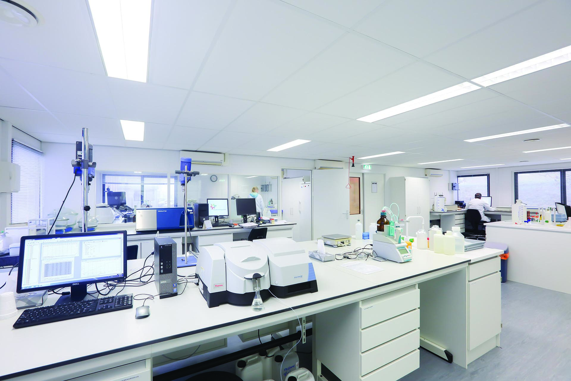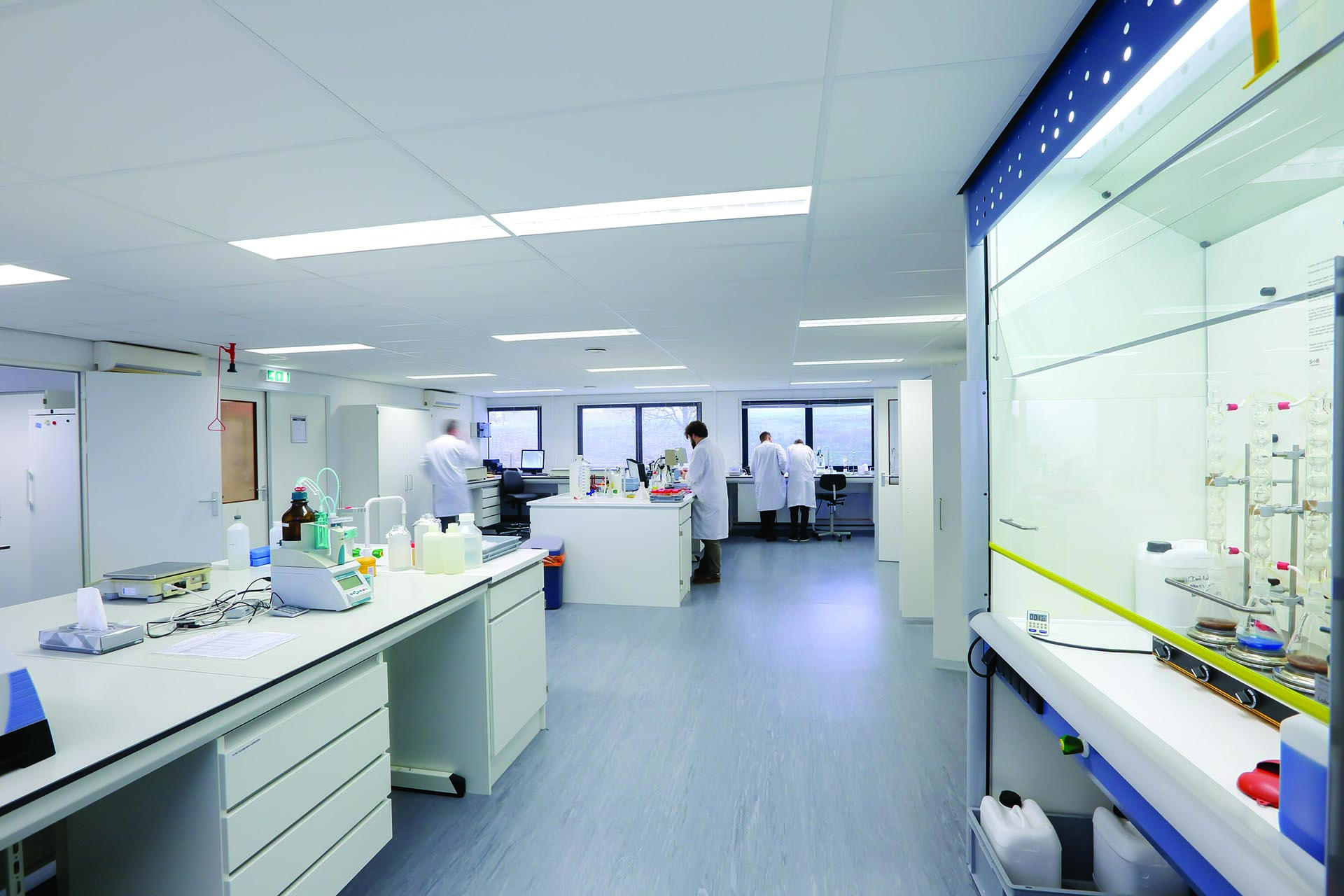 La solution pour le CSK a été trouvée dans un bâtiment modulaire composé de 14 unités Duplex 402 connectées. "Comme le bâtiment a une fonction de laboratoire, un certain nombre d'exigences ont dû être respectées. Il y a de nombreux bains d'eau et beaucoup de vapeur, donc une excellente climatisation et ventilation est très importante. L'absorption des fluctuations de température, en particulier, pose des exigences spécifiques. En outre, les propriétés hygiéniques sont importantes. Il ne doit pas y avoir de joints ni de fissures et les murs doivent être lisses. Nous avons choisi d'appliquer un système de plafond dans un certain nombre de pièces ; une belle finition propre et cela profite également à l'acoustique. La couleur de l'extérieur du bâtiment est également faite sur mesure - on lui a donné la même couleur blanche que l'usine, de sorte qu'elle forme un bel ensemble. Le résultat est impressionnant ! Nous travaillons efficacement et avec plaisir dans le laboratoire !"