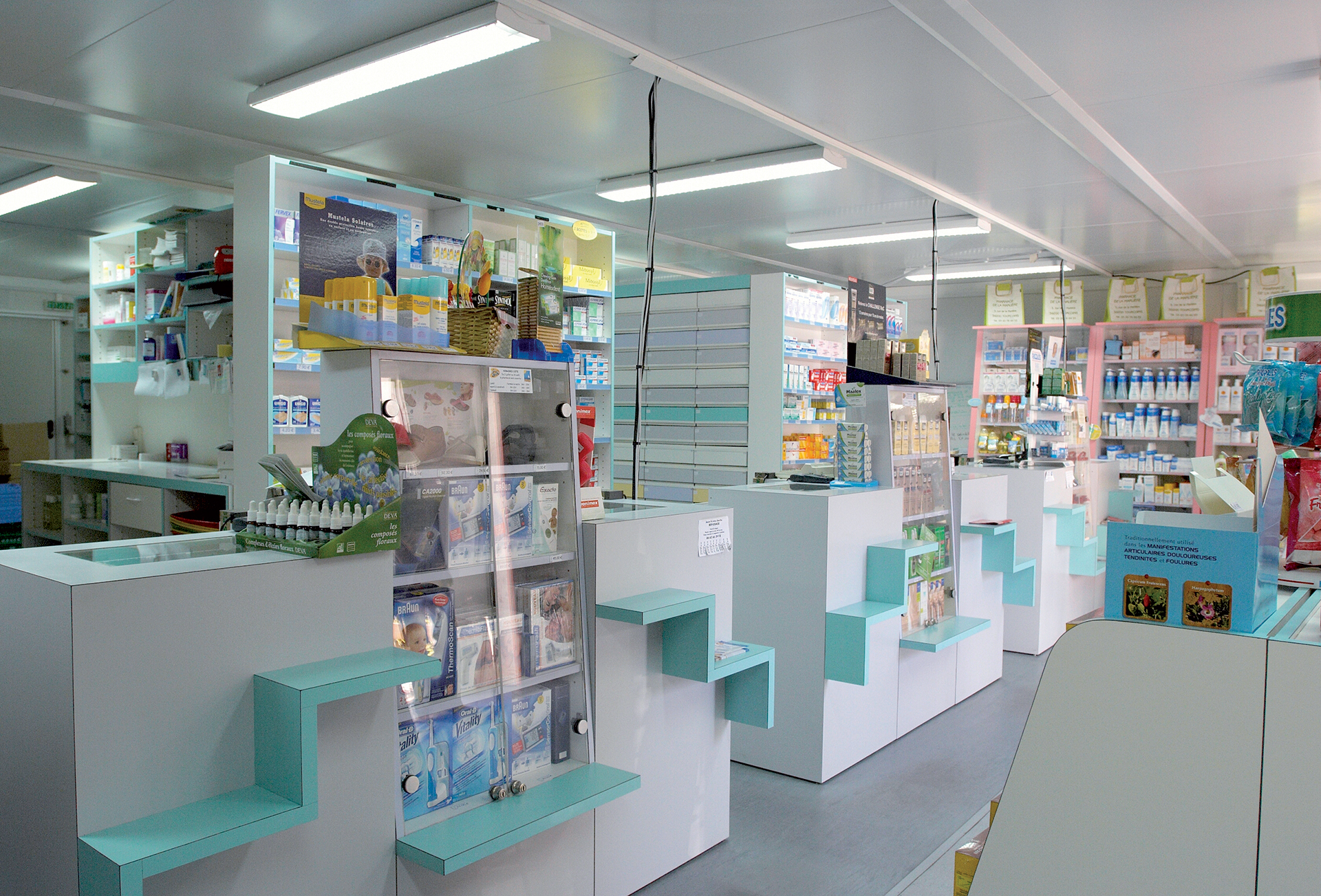 5 jours seulement après la signature, une surface de 110 m² était mise en place sur le parking de la pharmacie. Les bâtiments modulaires ont été aménagés comme une officine traditionnelle avec ses réserves et son espace parapharmacie immédiatement opérationnels, qui aura permi d'accueillir les clients dès le début des travaux.