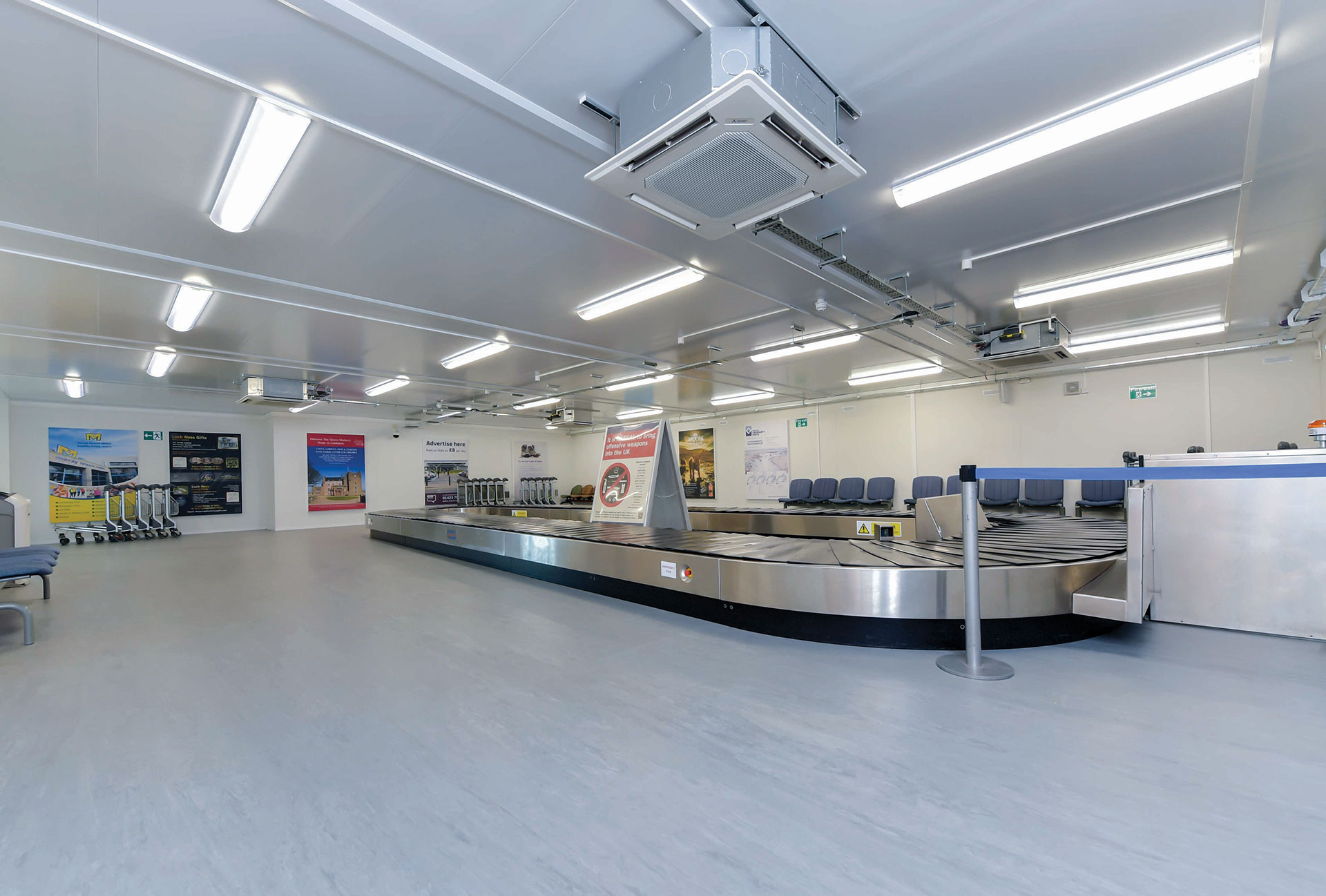 Portakabin created a bespoke new arrivals facility using its energy-efficient Ultima building system. The 381m2 building houses a UK Border Force office and high-security server room, an interview room and HM Customs area, as well as a large open-plan baggage reclaim area.