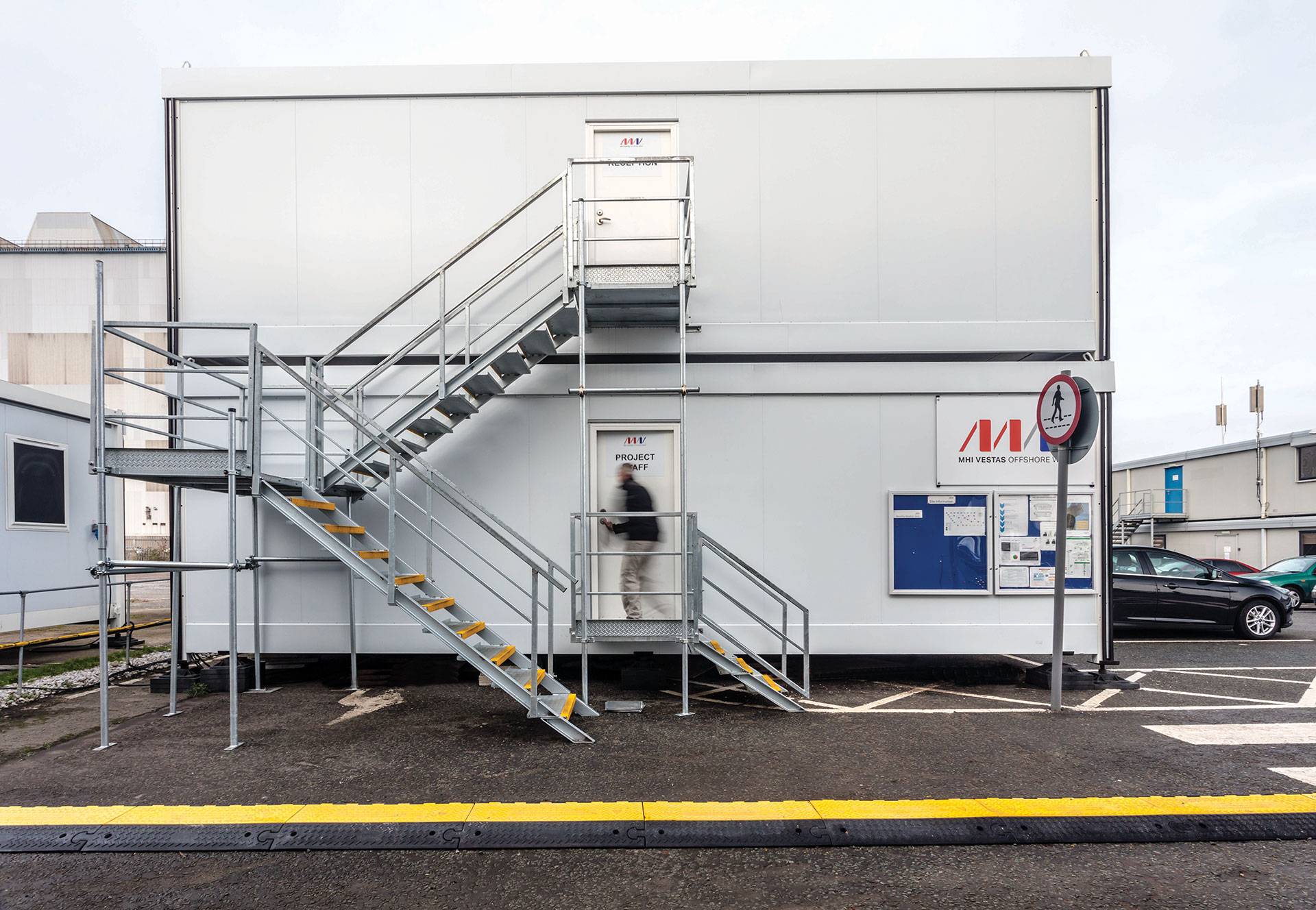 MHI Vestas chose a large modular building rather than stand-alone units, giving them the flexibility to adapt the interior to their requirements. Portakabin (Site Accommodation) supplied a two-storey building constructed from 22 energy-efficient modules, providing 270m2 of versatile space on each floor. The top floor was configured with several individual offices and toilet facilities. The ground floor was left completely open plan, apart from a toilet facility, to allow MHI Vestas to configure the space as required.