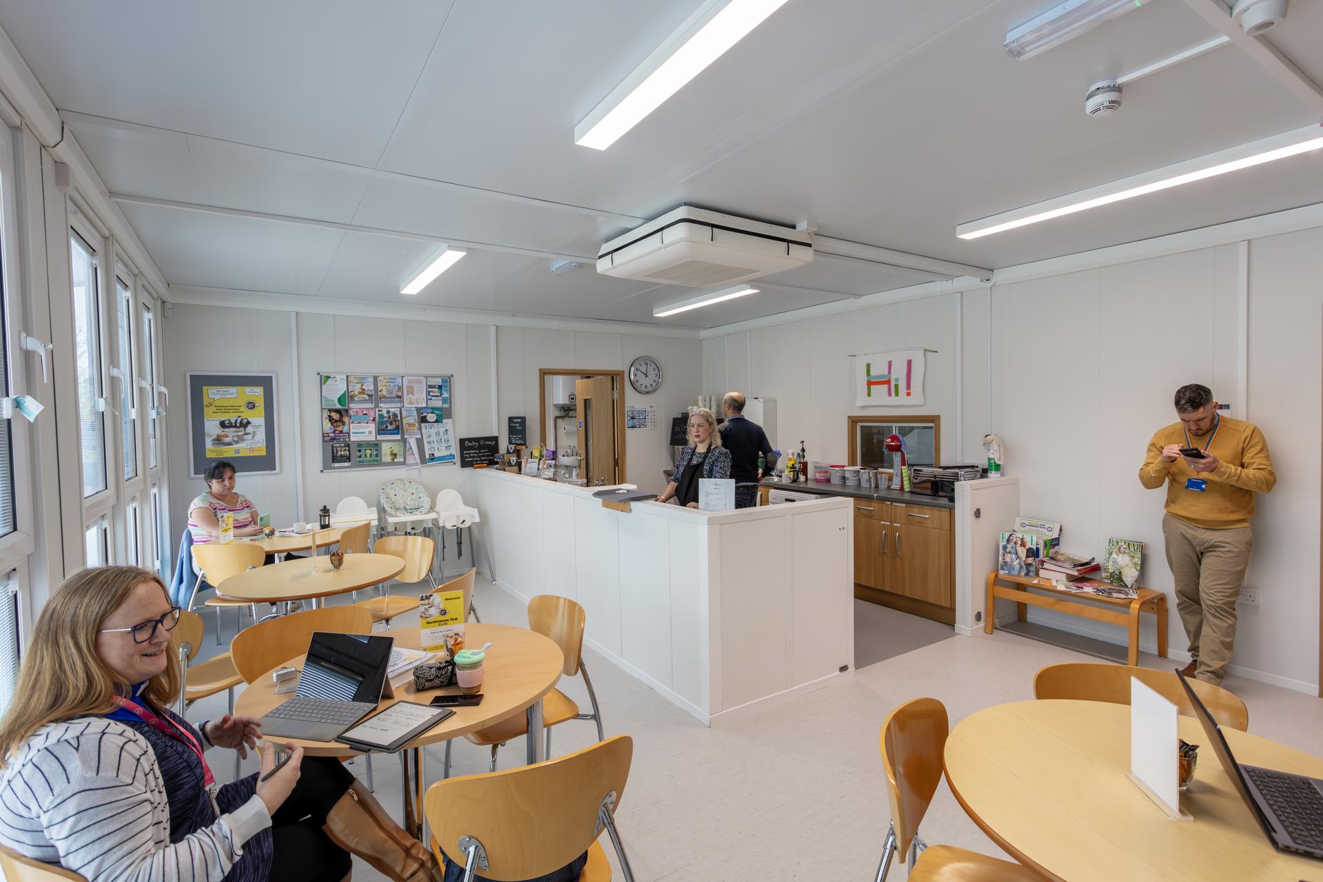 Complete with external vinyl wrap and canopy, landscaped exterior and cantilever partition in the main hall to allow for mixed use space, the finished centre is a dedicated space for the entire community of Northstowe to use as well as the surrounding areas. The temporary building is available for a range of groups and uses including the local food bank, Rainbows, arts and crafts activities, a youth café, local entrepreneurs, birthday parties, a range of NHS community services and more.