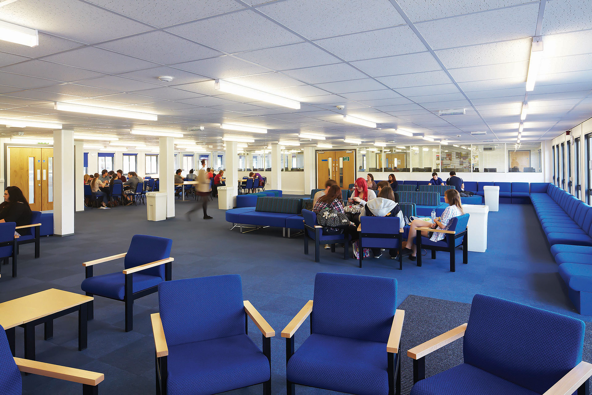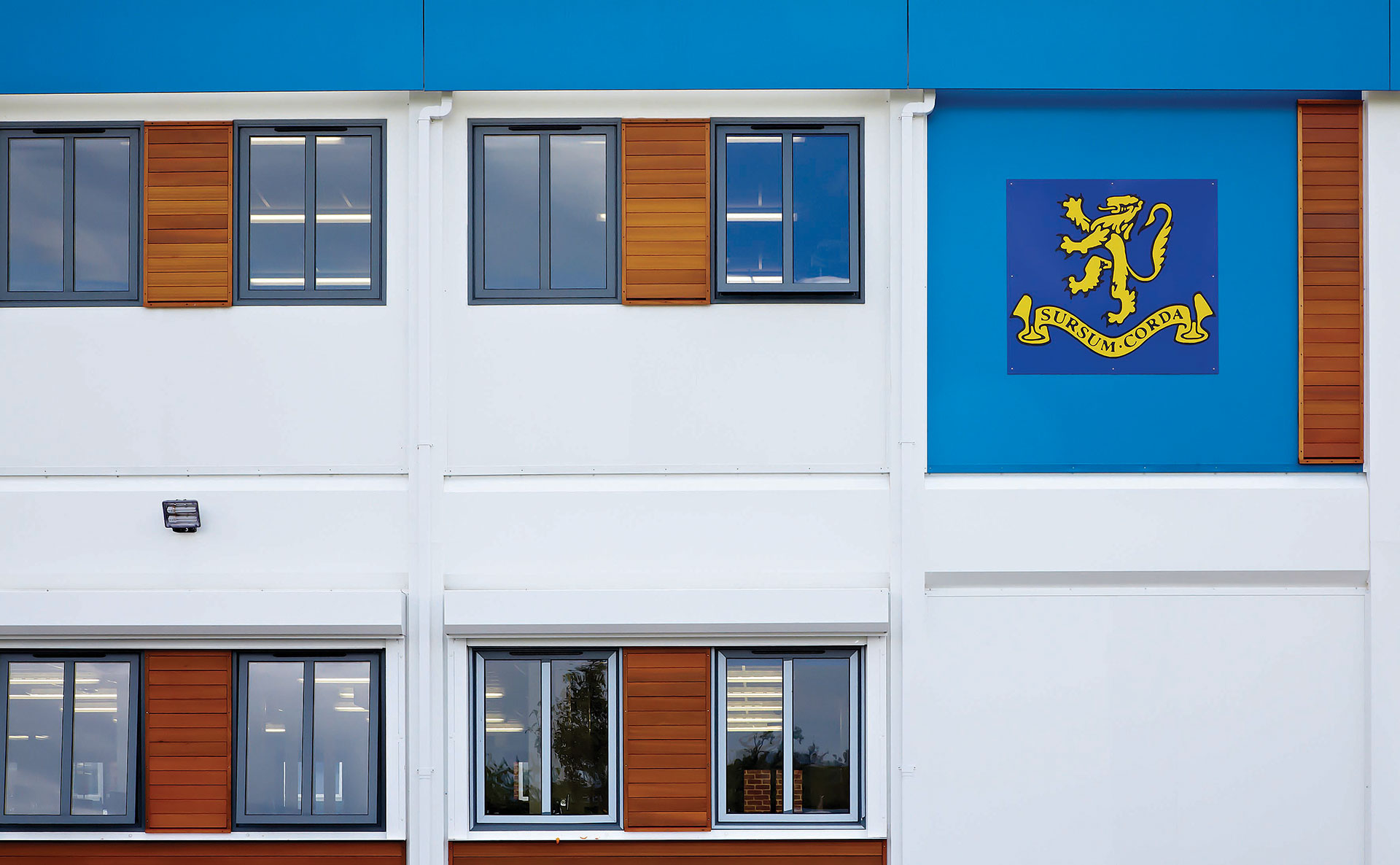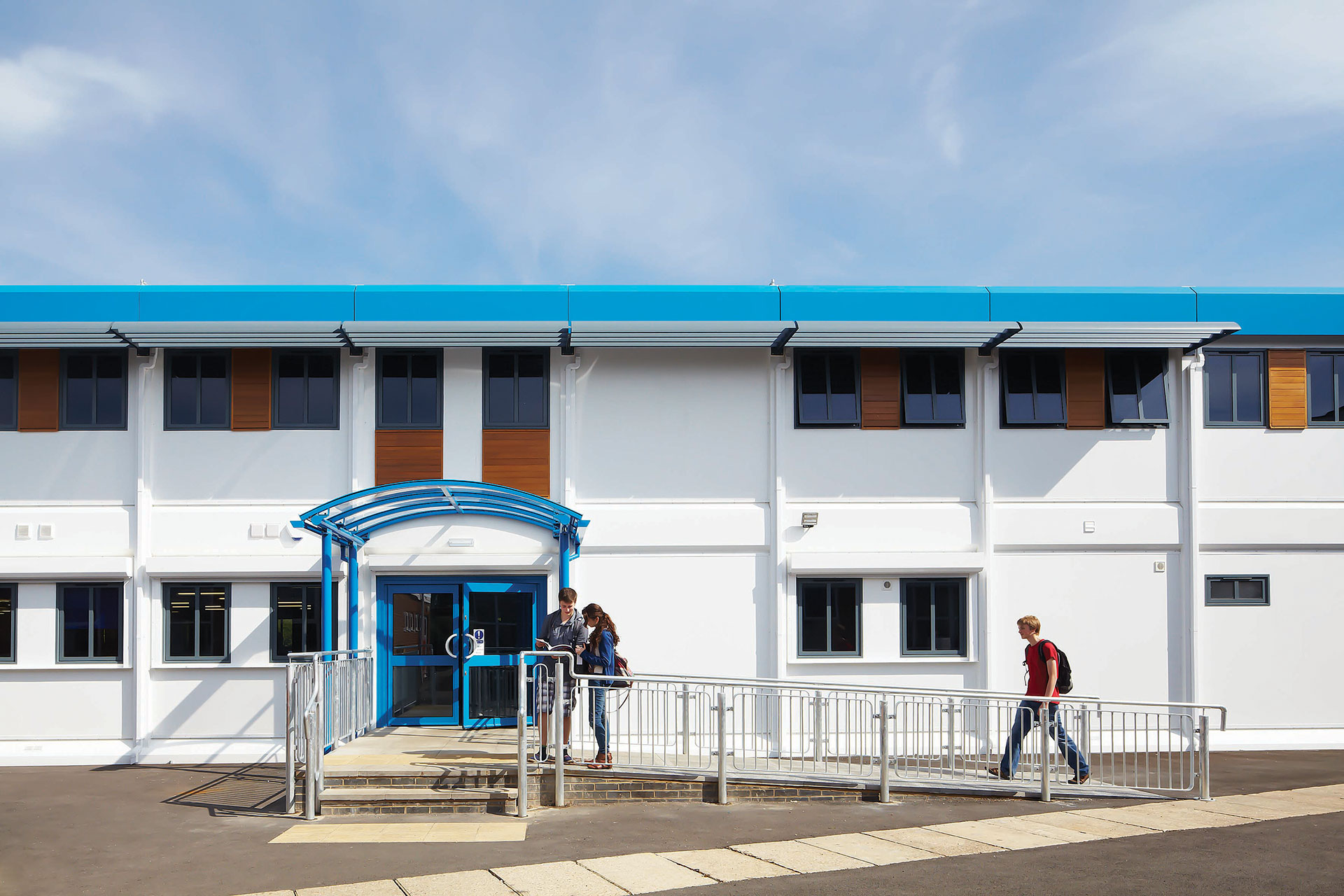 Externally, the teaching block was designed to replicate the sixth form centre in line with school’s specific requirements. It has a blue and white colour scheme with The Piggott School emblem featured on one elevation, timber cladding, brise soleil and a canopy over the entrance.