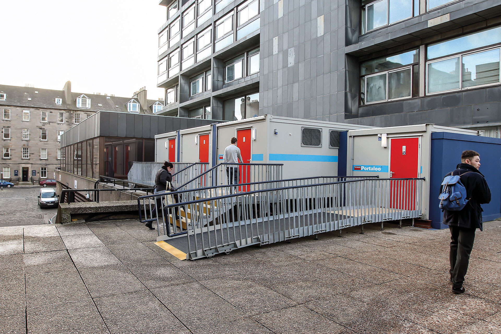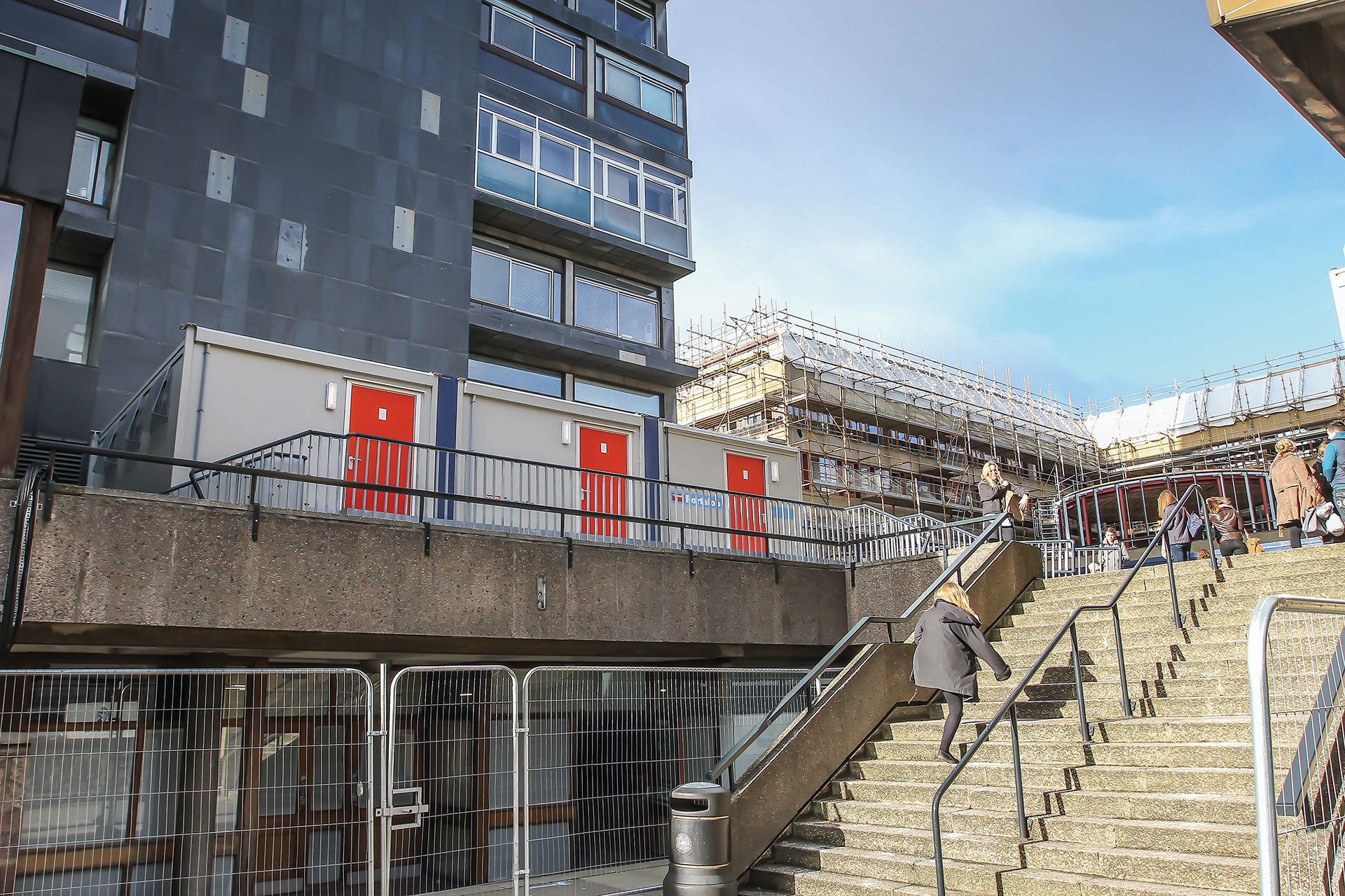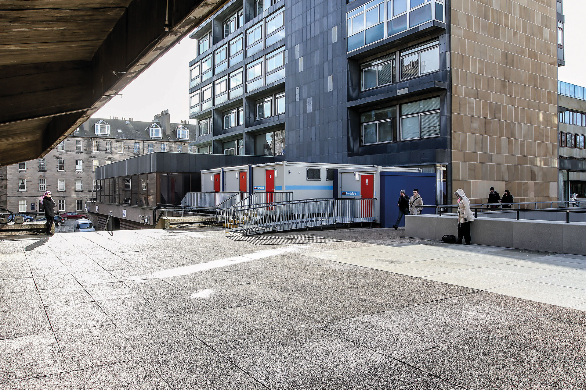 The University of Edinburgh embarked on a major refurbishment of the Grade A listed David Hume Tower to create a contemporary new teaching hub in the central area. The award winning Page/Park Architects project was designed to create a new sunken garden with glazed links to the David Hume Tower lecture theatres and directly onto George Square. The project required toilet facilities to be decanted to a podium roof area of the building for 78 weeks during ongoing work.