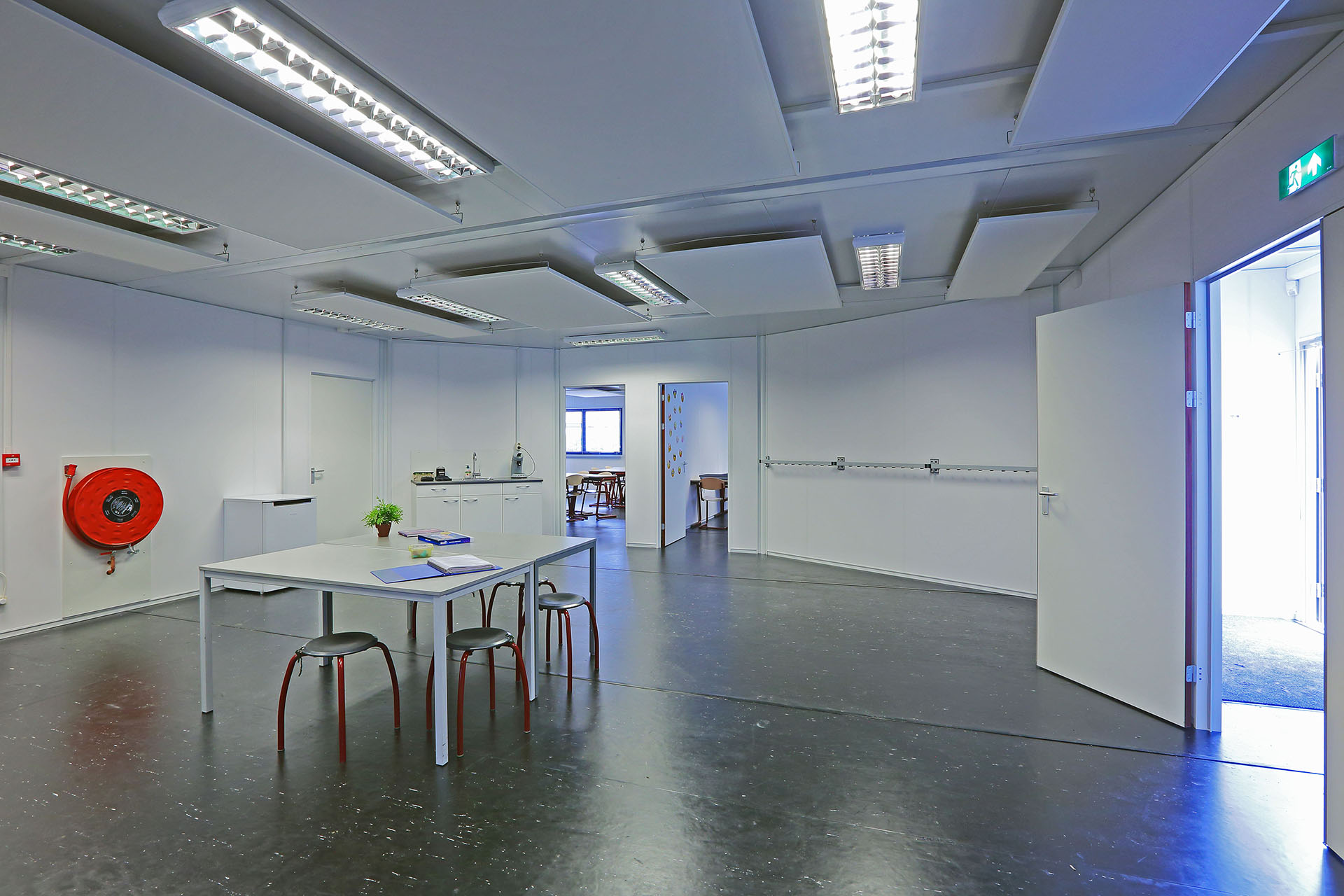 De oplossing werd gevonden in een modulair gebouw, dat op elk ander gebouw lijkt vanaf de buitenkant. Echter, van binnen heeft het een unieke indeling! De achthoekige gang en gemeenschappelijke ruimte nodigt leerlingen uit om samen te werken en zorgt voor 3 klaslokalen van gelijke grootte. Het gebouw heeft ruime en lichte klaslokalen.